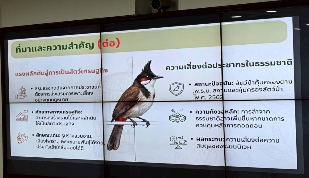 วันที่ 12 ธันวาคม 2568 คณะกรรมการสงวนและคุ้มครองสัตว์ป่ามีมติสำคัญในการประชุมครั้งล่าสุด เห็นชอบให้ถอดชื่อ "นกปรอดหัวโขน" หรือ "นกกรงหัวจุก" ออกจากบัญชีสัตว์ป่าคุ้มครอง โดยมีเป้าหมายเพื่อสร้างสมดุลระหว่างการอนุรักษ์และการพัฒนาประเทศ