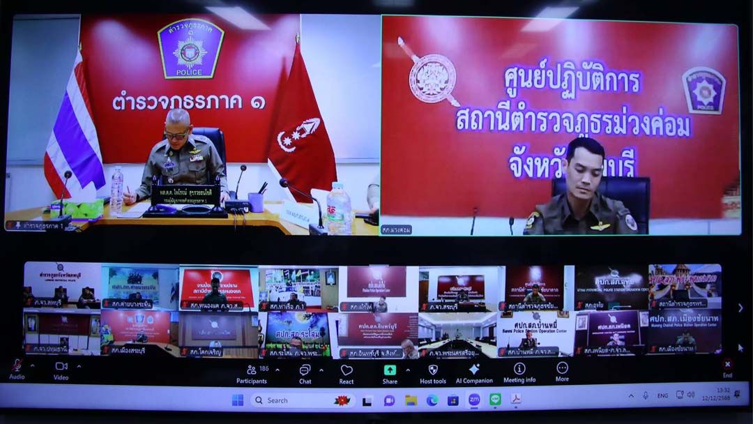 ทั้งนี้ มี พล.ต.ต.ภัคพงศ์ สายอุบล ผบก.อก.ภ.1 , ผบก.ภ.จว.ในสังกัด ภ.1 ผ่านระบบ Video conference , รอง ผบก.ภ.จว.ในสังกัด ภ.1 (รับผิดชอบงานป้องกันปราบปราม และรับผิดชอบงานมั่นคง) ผ่านระบบ Video conference , พ.ต.อ.สุริยะ สุดกังวาล รอง ผบก.อก.ภ.1 , ผกก.,หน.สภ. ในสังกัด ภ.1 ผ่านระบบ Video conference , พ.ต.อ.สาโรจน์ ลิ้มวสุไพศาล ผกก.ฝอ.2 บก.อก. , พ.ต.อ.สมภพ เชาว์เพชรไพโรจน์ ผกก.ฝอ.3 บก.อก. และเจ้าหน้าที่เกี่ยวข้อง เข้าร่วมประชุม