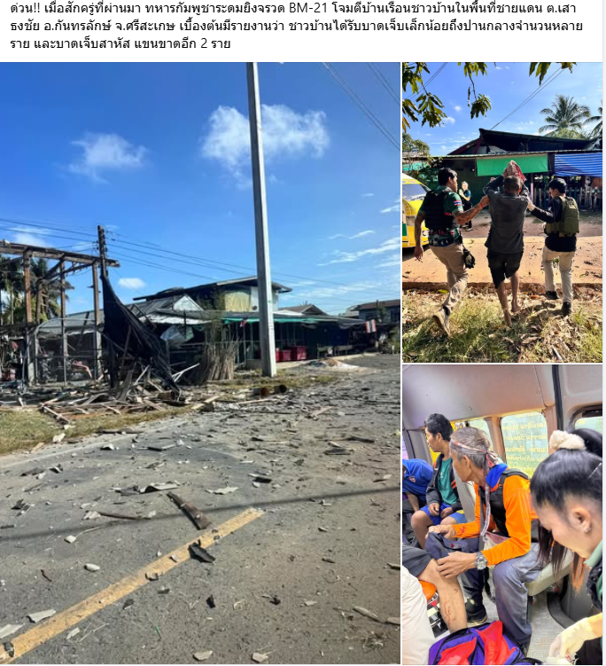นาทีระทึก! BM-21 ถล่มศรีสะเกษ ทหารกัมพูชาระดมยิงจรวดใส่บ้านเรือนที่กันทรลักษ์ ชาวบ้านบาดเจ็บสาหัส-แขนขาด 2 ราย