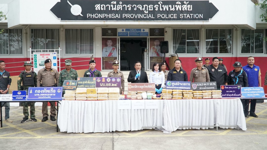 วันที่ 13 ธันวาคม 2568 ที่หน้าสถานีตำรวจภูธรโพนพิสัย จังหวัดหนองคาย นายศรัณย์ศักด์ ศรีเครือเนตร ผู้ว่าราชการจังหวัดหนองคาย, พ.ต.อ.ประภาส ธิติศักดิ์ รอง ผบก.ภ.จว.หนองคาย, พ.ต.อ.วิทยาภรณ์ ษมากรวิทิต ผกก.สภ.โพนพิสัย พร้อมด้วยนายด่านศุลกากรหนองคาย และกำลังเจ้าหน้าที่ตำรวจ ทหาร ฝ่ายปกครอง ได้ร่วมกันแถลงข่าวการตรวจยึดยาเสพติดล็อตใหญ่ โดยของกลางที่ตรวจยึดได้ประกอบด้วย ยาบ้า จำนวน 870,000 เม็ด , เฮโรอีน จำนวน 2 ห่อ (รวมประมาณ 700 กรัม) และเคตามีน จำนวน 2 ถุง (รวมประมาณ 2 กิโลกรัม)