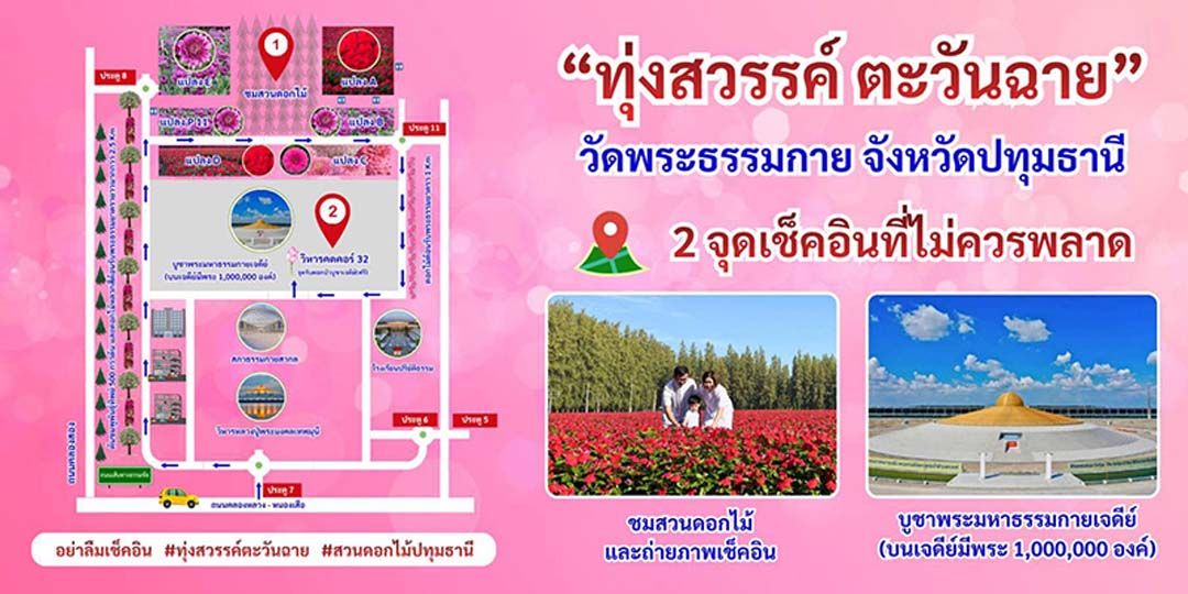 นอกจากจุดเช็คอินที่สวนดอกไม้แล้ว ยังมีพระมหาธรรมกายเจดีย์ เป็นจุดเช็คอินแห่งที่ 2 ซึ่งเป็นเจดีย์แห่งพระรัตนตรัย เจดีย์พระพุทธเจ้าล้านพระองค์ เพราะมีพุทธปฏิมากรแทนพระสัมมาสัมพุทธเจ้าประดิษฐานที่พระมหาธรรมกายเจดีย์ถึง 1 ล้านองค์ ถือเป็นสถานที่ศักดิ์สิทธิ์ที่สามารถเข้ามากราบสัการะบูชา สวดมนต์ นั่งสมาธิ เวียนประทักษิณ หรือมาเจริญสมาธิทางปัญญาได้ การสวดมนต์นี้ ทางวัดจะเปิดเสียงสวดมนต์บทสวดธัมมจักกัปปวัตตนสูตรตลอด 24 ชั่วโมง หรือจะสวดมนต์พร้อมเวียนประทักษิณไปด้วยก็ดี เป็นการทำสมาธิในอิริยาบถเดิน ทั้งนี้ ขอความร่วมมือผู้เข้าชมสวนดอกไม้และบูชาพระมหาธรรมกายเจดีย์ ดังนี้ 1.ขอความร่วมมืองดบินโดรน เนื่องจากเป็นพื้นที่ส่วนบุคคล และ 2.งดนำพาสัตว์เลี้ยงเข้าพื้นสวนดอกไม้