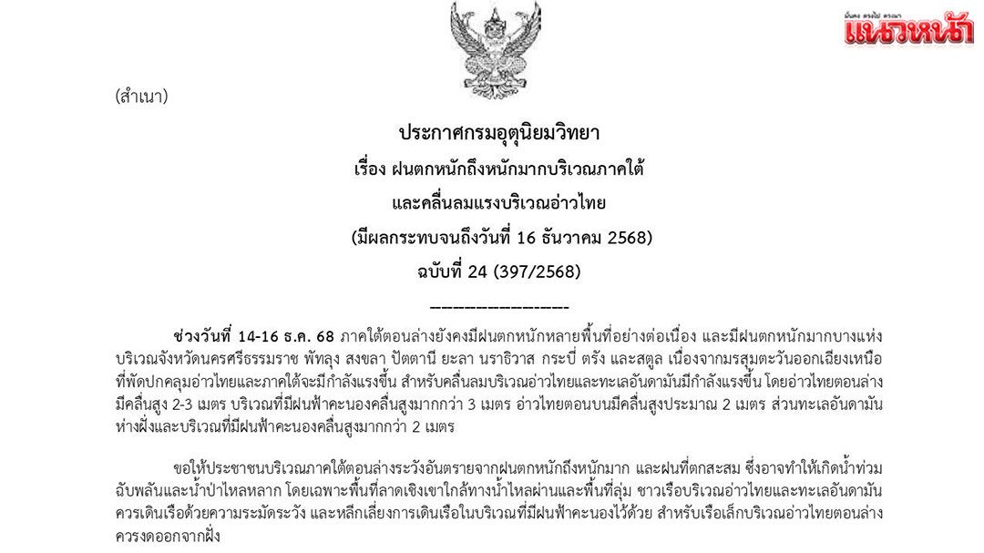 “ช่วงวันที่ 14-16ธ.ค.68 มีฝนตกหนักถึงหนักมากบางแห่งบริเวณจังหวัดนครศรีธรรมราช พัทลุง สงขลา ปัตตานี ยะลา และ จ.นราธิวาส”ขอให้ประชาชนระวังอันตรายจากฝนตกหนักถึงหนักมาก และฝนตกสะสม ซึ่งอาจทำให้พื้นที่เสี่ยงภัยเกิดน้ำท่วมฉับพลัน น้ำป่าไหลหลาก น้ำล้นตลิ่ง และดินโคลนถล่มในพื้นที่ลาดชัน คลื่นลมอ่าวไทยตอนล่างมีความสูง 2-3 เมตร เรือเล็กควรงดออกจากฝั่งในช่วงนี้