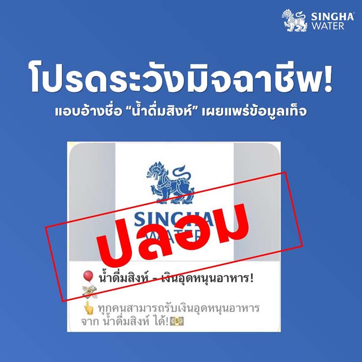 15 ธันวาคม 2568 พลตำรวจตรี ภัคพงศ์ สายอุบล ผบก.อก.ภ.1 ในฐานะรองโฆษกตำรวจภูธรภาค 1/ ศูนย์ปราบปรามอาชญากรรมทางเทคโนโลยีสารสนเทศ กองบัญชาการตำรวจภูธรภาค 1 เปิดเผยว่า ได้รับแจ้งจากนายฉัตรชัย วิรัตน์โยสินทร์ ผู้ช่วยประธานกรรมการบริหาร บริษัทบุญรอดบริวเวอรี่ จำกัด ว่า มีการปลอมเพจของทางบริษัท แล้วแอบอ้างชื่อ “น้ำดื่มสิงห์” ชวนให้ลงทะเบียนรับเงินอุดหนุนค่าอาหาร รวมถึงให้กดลิงก์ ที่หลอกลวงว่ามีรางวัลให้ จึงขอเตือนว่าเป็นเพจปลอม อย่ากดลิงก์เพราะเป็นลิงก์ดูดเงิน หรือทำให้เกิดการสูญเสียทรัพย์สินต่างๆของประชาชนและลูกค้าของบริษัทเป็นอย่างมาก