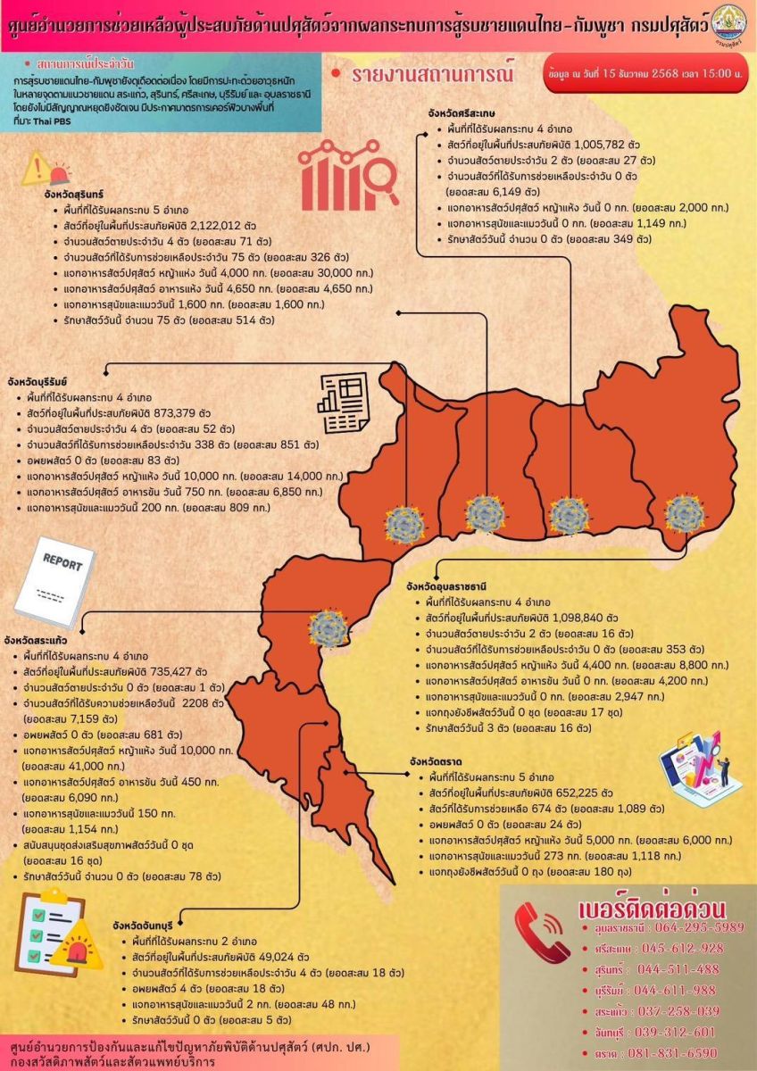 กรมปศุสัตว์ย้ำเกณฑ์เยียวยาความเสียหาย 7 จังหวัดชายแดนไทย–กัมพูชา ล่าสุดเกษตรกรได้รับผลกระทบกว่า 2 แสนราย มีสัตว์ในพื้นที่รวม 6.5 ล้านตัว ส่งความช่วยเหลืออย่างต่อเนื่อง