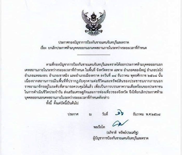 เมื่อวันที่ 16 ธันวาคม 2568 พลเรือโท อภิชาติ ทรัพย์ประเสริฐ ผู้บัญชาการป้องกันชายแดนจันทบุรีและตราด ได้ออกประกาศกองบัญชาการป้องกันชายแดนจันทบุรีและตราด เรื่อง ยกเลิกประกาศห้ามบุคคลออกนอกเคหสถานภายในระหว่างระยะเวลาที่กำหนด โดยระบุว่า