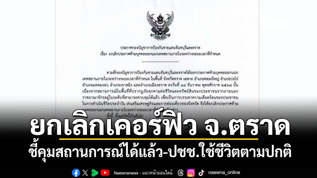 ตามที่กองบัญชาการป้องกันชายแดนจันทบุรีและตราดได้ออกประกาศห้ามบุคคลออกนอกเคหสถานภายในระหว่างระยะเวลาที่กำหนด ในพื้นที่ จังหวัดตราด เฉพาะ อำเภอคลองใหญ่ อำเภอบ่อบ่อไร่ อำเภอแหลมงอบ อำเภอเขาสมิง และอำเภอเมืองตราด ลงวันที่ 14 ธันวาคม พุทธศักราช 2568 นั้น