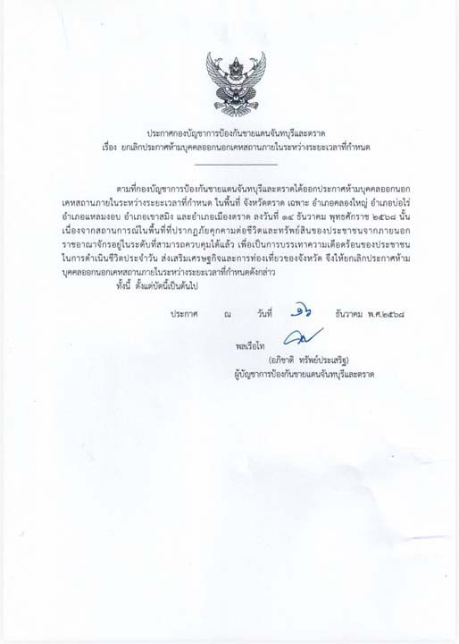 ขณะที่เมื่อเวลา 15.30 น.วันนี้ (16 ธ.ค.68) กองบัญชาการป้องกันชายแดนจันทบุรีและตราด (กปช.จต.) ออกประกาศคำสั่ง ยกเลิกมาตรการห้ามออกนอกเคหสถาน (เคอร์ฟิว) ในพื้นที่ 5 อำเภอ ได้แก่ อำเภอเมืองตราด, อำเภอบ่อไร่, อำเภอคลองใหญ่, อำเภอแหลมงอบ และอำเภอเขาสมิง โดยระบุว่าเจ้าหน้าที่ฝ่ายความมั่นคงสามารถควบคุมสถานการณ์ความไม่สงบภายในพื้นที่ตัวเมืองได้แล้ว (อ่านข่าวที่เกี่ยวข้อง : ด่วน!ยกเลิกเคอร์ฟิว จ.ตราด ชี้คุมสถานการณ์ได้แล้ว-ปชช.ใช้ชีวิตตามปกติ)