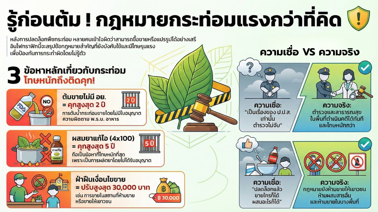 ทั้งนี้ ขอสร้างความเข้าใจที่ถูกต้องว่า การบังคับใช้กฎหมายกับร้านค้าที่ "ต้ม-ผสม-ขาย" น้ำกระท่อม เป็นอำนาจหน้าที่ของ เจ้าหน้าที่ตำรวจ และ เจ้าหน้าที่สาธารณสุข ในพื้นที่ ซึ่งสามารถเข้าจับกุมและดำเนินคดีได้ทันที โดยมีบทลงโทษที่รุนแรงถึงขั้นจำคุก ได้แก่ ความผิดตาม พ.ร.บ.ยา มีโทษจำคุกไม่เกิน 5 ปี และปรับไม่เกิน 10,000 บาท ส่วนความผิดตาม พ.ร.บ.อาหาร มีโทษจำคุกตั้งแต่ 6 เดือนถึง 2 ปี และปรับตั้งแต่ 5,000 ถึง 20,000 บาท