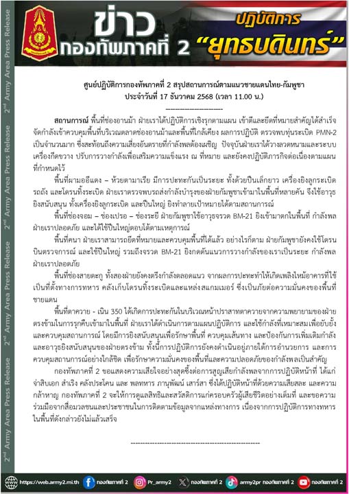 17 ธันวาคม 2568 ศูนย์ปฏิบัติการกองทัพภาคที่ 2 รายงานสรุปสถานการณ์การรบปะทะตามแนวชายแดนไทย-กัมพูชา วันที่ 17 ธันวาคม 2568 ในห้วงเวลา 12.00 น.ของวันนี้ โดยมีเหตุการณ์ที่สำคัญดังนี้