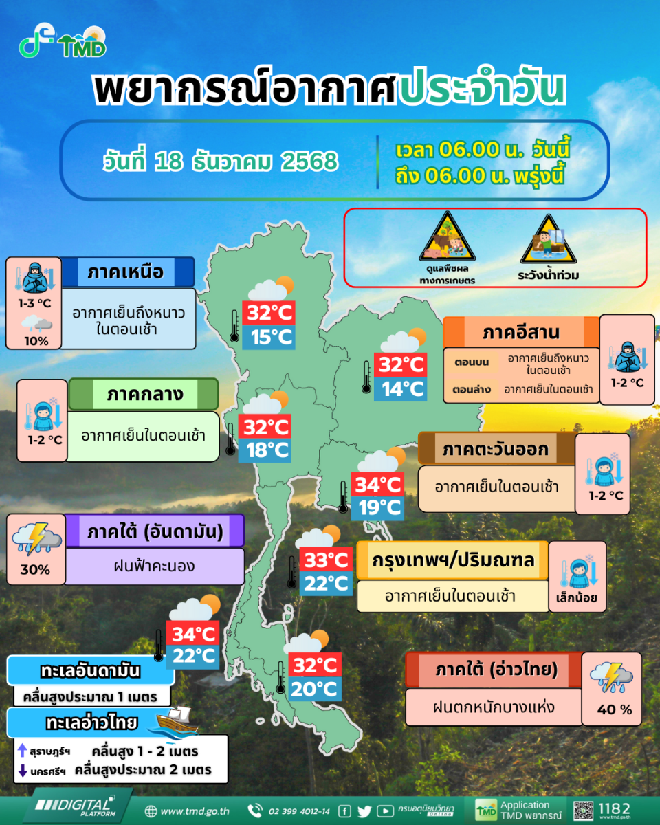 18 ธ.ค.68 กรมอุตุนิยมวิทยา รายงานว่า พยากรณ์อากาศ 24 ชั่วโมงข้างหน้า ประเทศไทยตอนบนมีอากาศเย็นถึงหนาวในตอนเช้า และอุณหภูมิจะลดลง 1-3 องศาเซลซียส โดยมีฝนเกิดขึ้นได้บางพื้นที่ ในภาคเหนือตอนบนและภาคตะวันออกเฉียงเหนือตอนบน เนื่องจากบริเวณความกดอากาศสูงหรือมวลอากาศเย็นยังคงปกคลุมประเทศไทยตอนบน ในขณะที่คลื่นกระแสลมฝ่ายตะวันตกจากประเทศเมียนมาเคลื่อนเข้าปกคลุมภาคเหนือและประเทศลาวตอนบน ขอให้ประชาชนในบริเวณดังกล่าวดูแลรักษาสุขภาพเนื่องจากสภาพอากาศที่เปลี่ยนแปลง ส่วนเกษตรกรในภาคเหนือควรเตรียมการป้องกันและระวังความเสียหายที่อาจจะเกิดต่อผลผลิตทางการเกษตร