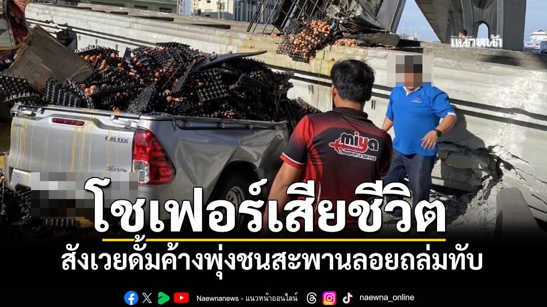 ดั้มยกค้างพุ่งชนสะพานลอยถล่มทับรถยับ คนขับกระบะส่งไข่เสียชีวิตแล้ว ตำรวจจ่ออายัดตัวโชเฟอร์ดำเนินคดี