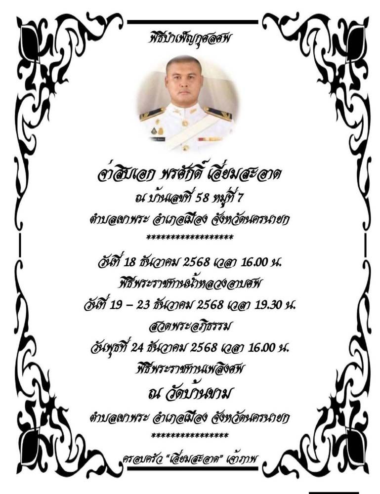 กำหนดการ สวด อภิธรรมศพ จ.ส.อ พร ศักดิ์ เอี่ยมสอาด (จ่าใหญ่) น้ำหลวงอาบศพ วันที่ 18 ธ.ค เวลา 16.00 ณ บ้านเลขที่ 58 ม.7 ตำบลเขาพระ สวดอภิธรรม วันที่ 19-23 ธ.ค เวลา19.30 ณ บ้านเลขที่ 58 ม.7 ตำลลเขาพระ พระราชทานเพลิง วันที่ 24 ธันวาคม 2568 เวลา16.00 ณ วัดบ้านขาม ม.7 ตำบลเขาพระ อำเภอเมือง จังหวัดนครนายก