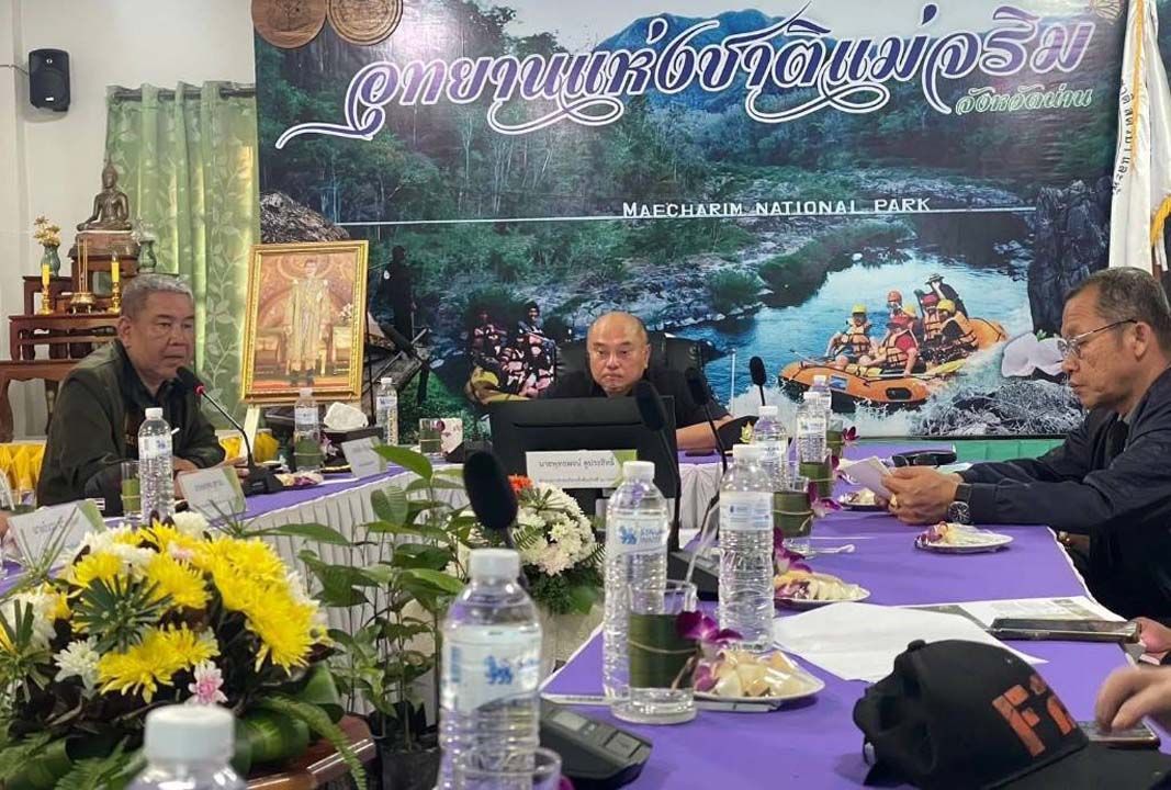 ที่ห้องประชุมที่ทำการอุทยานแห่งชาติแม่จริม อำเภอแม่จริม จังหวัดน่าน นายธันวา ม่วงทอง หัวหน้าอุทยานแห่งชาติแม่จริม พร้อมด้วยเจ้าหน้าที่ ให้การต้อนรับนายพุทธพจน์ คูประสิทธิ์ ผู้อำนวยการสำนักบริหารพื้นที่อนุรักษ์ที่ 13 พร้อมคณะ ประกอบด้วย นายเพลิน ขวัญนาค ผู้อำนวยการส่วนอุทยานแห่งชาติ นายสุริยา กาละสุข ผู้อำนวยการส่วนฟื้นฟูและพัฒนาพื้นที่อนุรักษ์ นายนพรัตน์ นวลอนงค์ ผู้อำนวยการส่วนประสานงานโครงการพระราชดำริ และนายยงยุทธ สุยานะ ผู้อำนวยการส่วนจัดการต้นน้ำและพัฒนาชุมชนในพื้นที่ป่าอนุรักษ์ ในโอกาสเดินทางลงพื้นที่ตรวจติดตามผลการปฏิบัติงานของอุทยานแห่งชาติแม่จริม