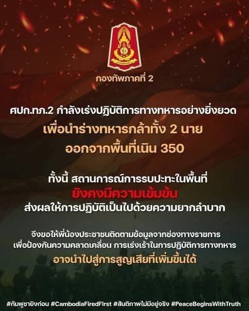 ศูนย์ปฏิบัติการกองทัพภาคที่ 2 กำลังเร่งปฏิบัติการทางทหารอย่างเต็มกำลัง เพื่อนำร่าง ทหารกล้าทั้ง 2 นาย ออกจากพื้นที่ เนิน 350 ด้วยความรอบคอบสูงสุด