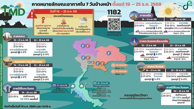 คาดหมายอากาศทั่วไป 20 – 26 ธันวาคม พ.ศ. 2568