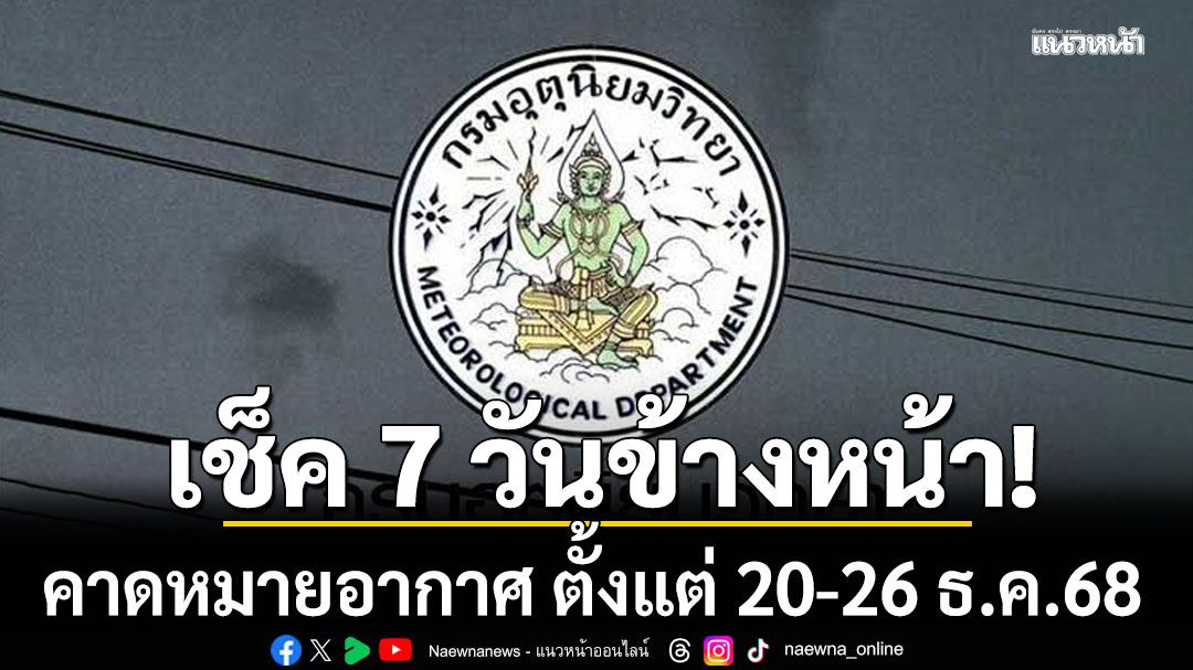 วันที่ 20 ธันวาคม 2568 เมื่อเวลา 12.00 น. กรมอุตุนิยมวิทยา คาดหมายอากาศทั่วไป พยากรณ์อากาศ 7 วันข้างหน้า ระหว่างวันที่ 20 – 26 ธันวาคม พ.ศ. 2568 ดังนี้