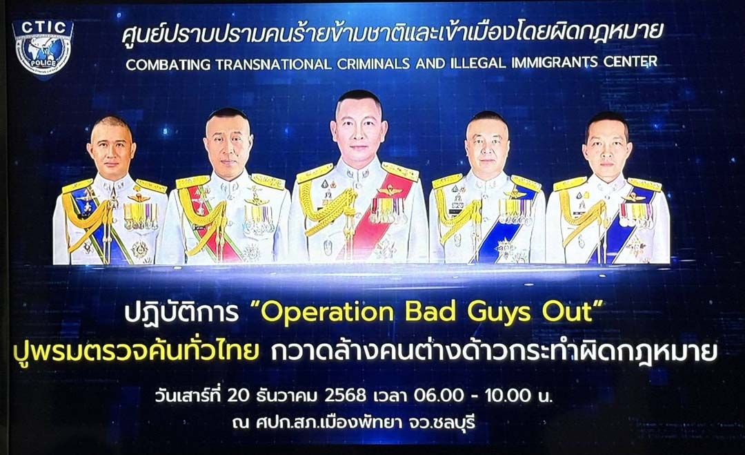 20 ธันวาคม 2568 พล.ต.อ.สำราญ นวลมา รองผู้บัญชาการตำรวจแห่งชาติ (รอง ผบ.ตร.) ลงพื้นที่ติดตามความคืบหน้าปฏิบัติการ “OPERATION BAD GUYS OUT” ปูพรมตรวจค้นและกวาดล้างคนต่างด้าวทุกสัญชาติที่กระทำผิดกฎหมายทั่วประเทศ รวมกว่า 144 จุด โดยมีการประชุมสั่งการผ่านระบบประชุมทางไกล (Zoom) รายงานสถานการณ์แบบเรียลไทม์ ณ ห้องประชุม ศปก.สภ.เมืองพัทยา