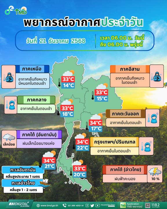 21 ธันวาคม 2568 กรมอุตุนิยมวิทยา รายงานลักษณะอากาศทั่วไป พยากรณ์อากาศ 24 ชั่วโมงข้างหน้า ภาคเหนือ และภาคตะวันออกเฉียงเหนือ มีอากาศเย็นถึงหนาว ส่วนภาคกลาง รวมทั้งกรุงเทพมหานครและปริมณฑล และภาคตะวันออกมีอากาศเย็นในตอนเช้า เนื่องจากมีลมตะวันตกเฉียงเหนือในระดับบนพัดปกคลุมประเทศไทยตอนบน ประกอบกับบริเวณความกดอากาศสูงปกคลุมประเทศไทยตอนบน ขอให้ประชาชนในบริเวณดังกล่าวดูแลรักษาสุขภาพเนื่องจากสภาพอากาศที่หนาวเย็น