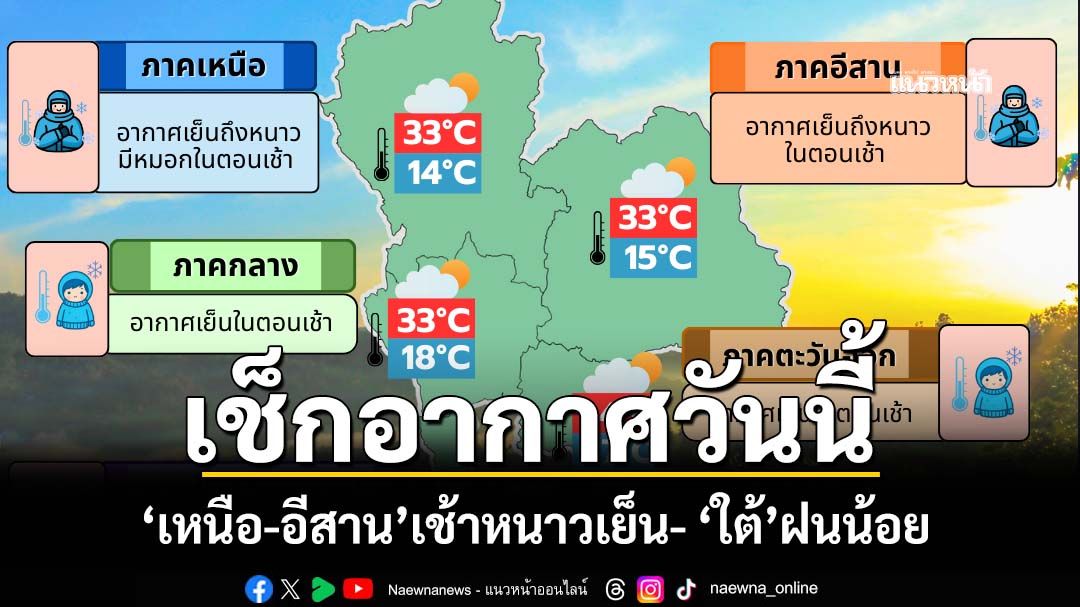 เช็กอากาศวันนี้!‘เหนือ-อีสาน-กทม.’เช้าหนาวเย็น ‘ใต้’ฝนน้อย ‘อ่าวไทย’คลื่นสูง 1-2 เมตร