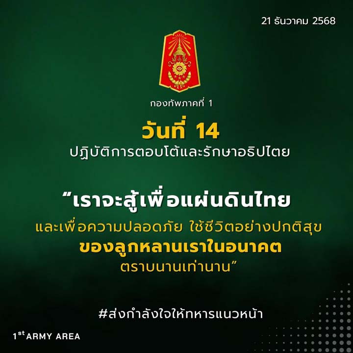 21 ธันวาคม 2568 เพจเฟซบุ๊ก “กองทัพภาคที่ 1” โพสต์ข้อความ ระบุว่า เข้าสู่วันที่ 14 ปฏิบัติการตอบโต้และรักษาอธิปไตย