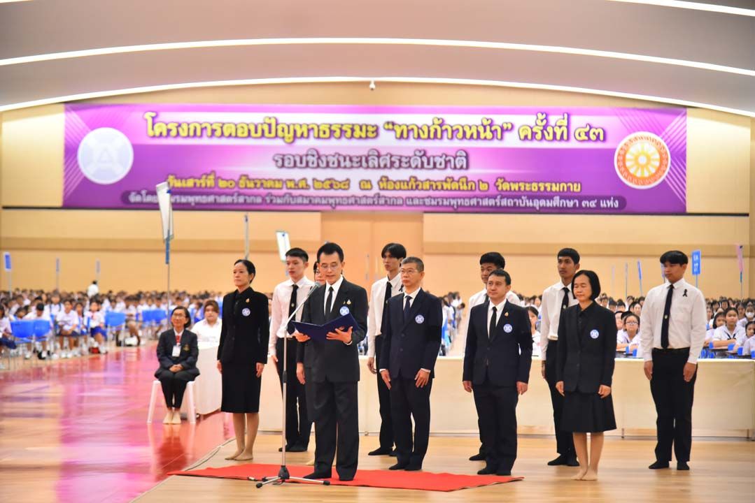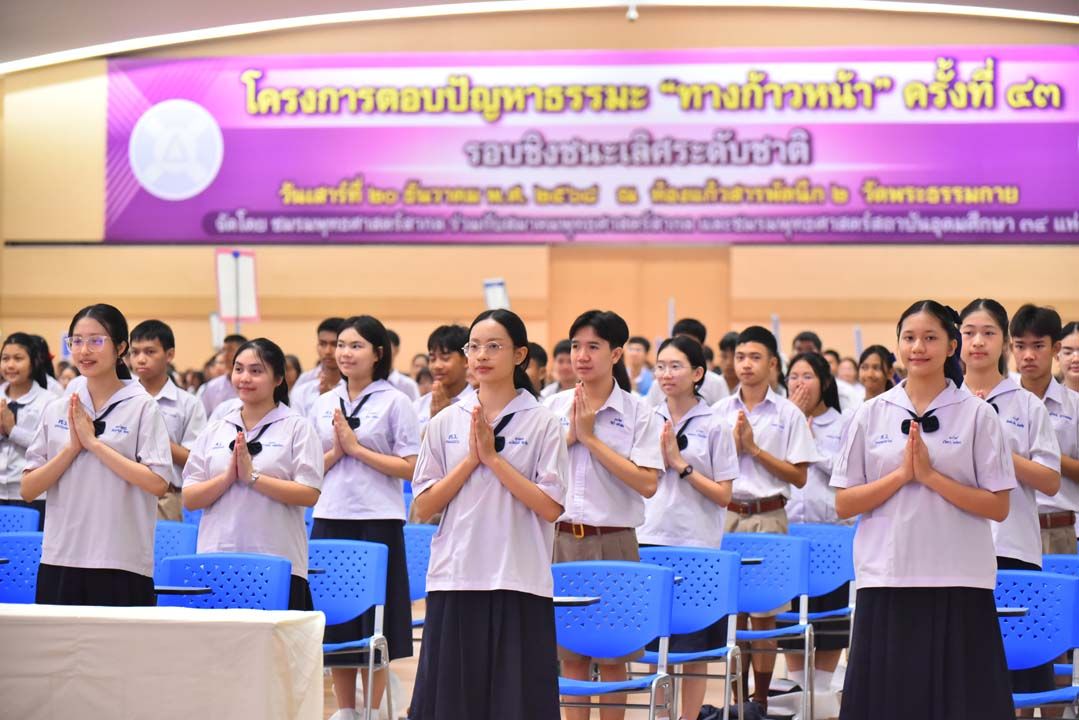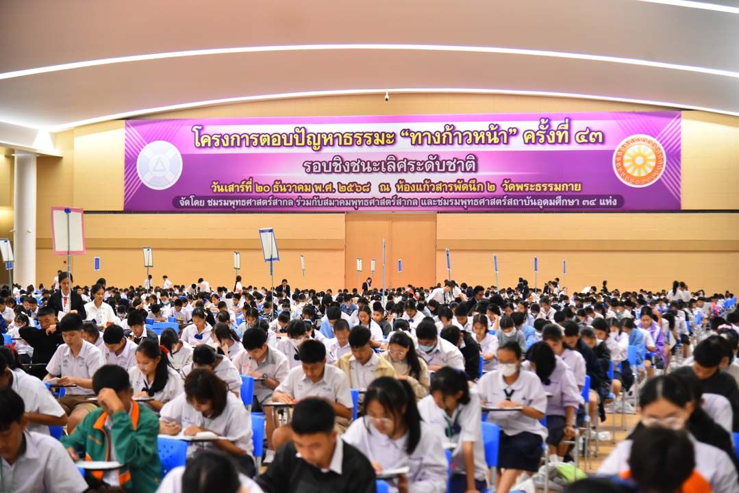 นายสันติ รุ่งสุขพลากร ประธานชมรมพุทธศาสตร์สากล กล่าวว่า “โครงการตอบปัญหาธรรมะ “ทางก้าวหน้า” ครั้งที่ 43 รอบชิงชนะเลิศระดับชาติ จัดขึ้น ณ ห้องแก้วสารพัดนึก 2 วัดพระธรรมกาย จ.ปทุมธานี มีผู้ผ่านเข้าสู่รอบชิงชนะเลิศระดับชาติ จากโรงเรียน 756 แห่ง แบ่งเป็น ระดับประถมศึกษาตอนต้น 3,180 คน ระดับประถมศึกษาตอนปลาย 372 คน ระดับมัธยมศึกษาตอนต้น 163 คน ระดับมัธยมศึกษาตอนปลาย 188 คน และครูอาจารย์ 451 คน รวมจำนวน 4,354 คน จากผู้สมัครเข้าร่วมโครงการทั่วประเทศ รวม 664,819 คน จากสถานศึกษา 3,269 แห่ง”