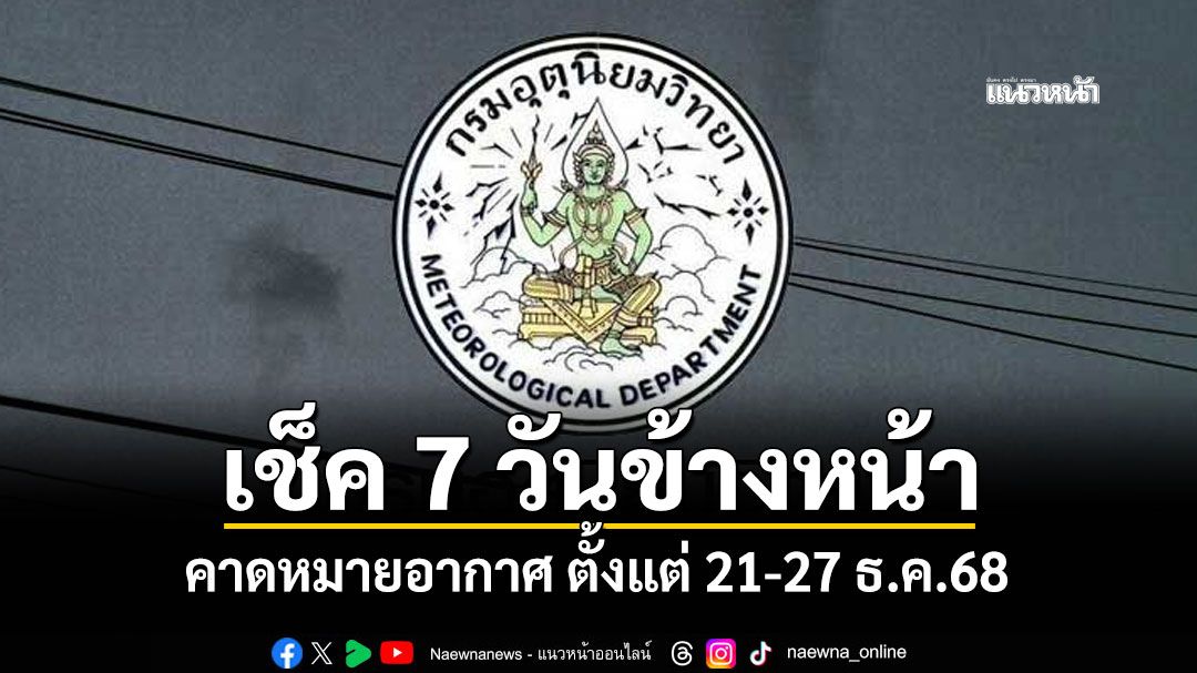 เมื่อเวลา 12.00 น.วันที่ 21 ธันวาคม 2568 กรมอุตุนิยมวิทยา คาดหมายอากาศทั่วไป พยากรณ์อากาศ 7 วันข้างหน้า ระหว่างวันที่ 21 - 27 ธันวาคม 2568 ดังนี้
