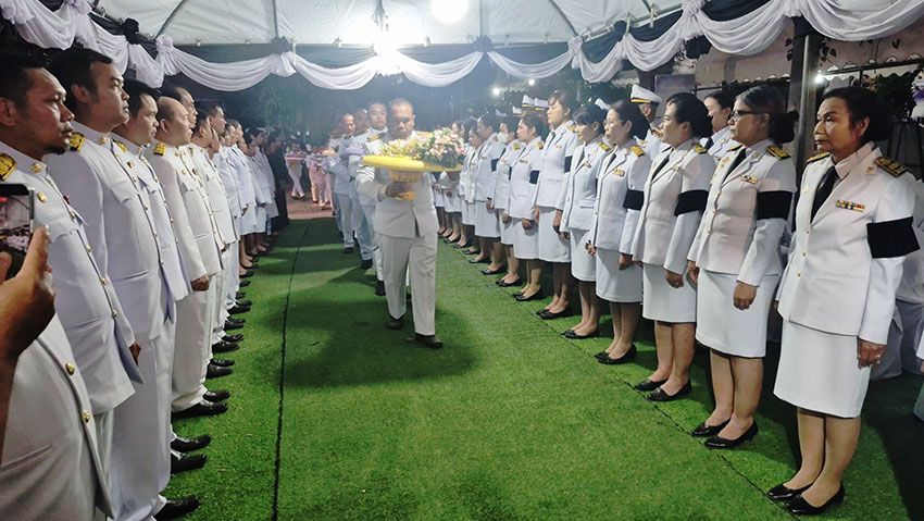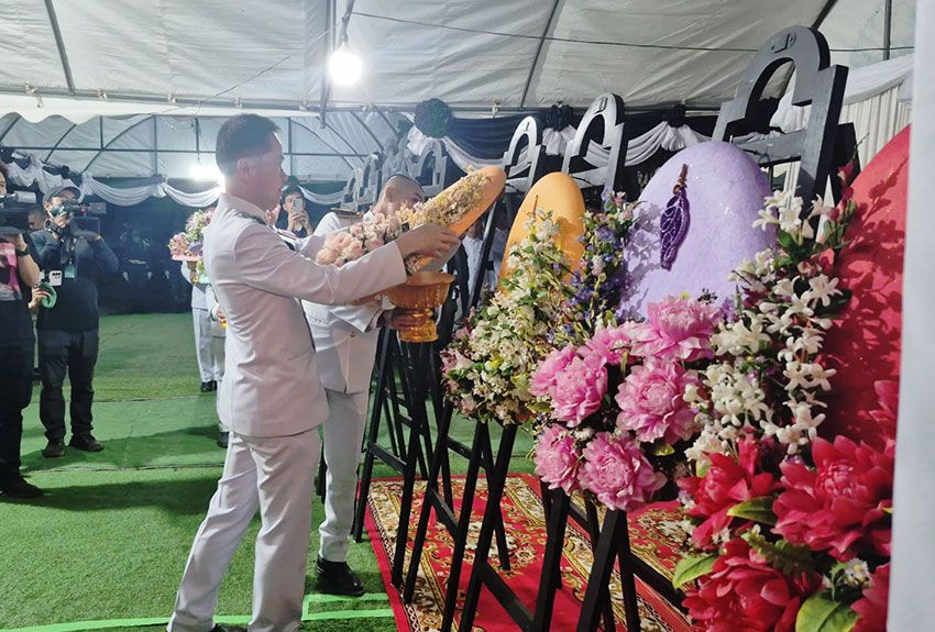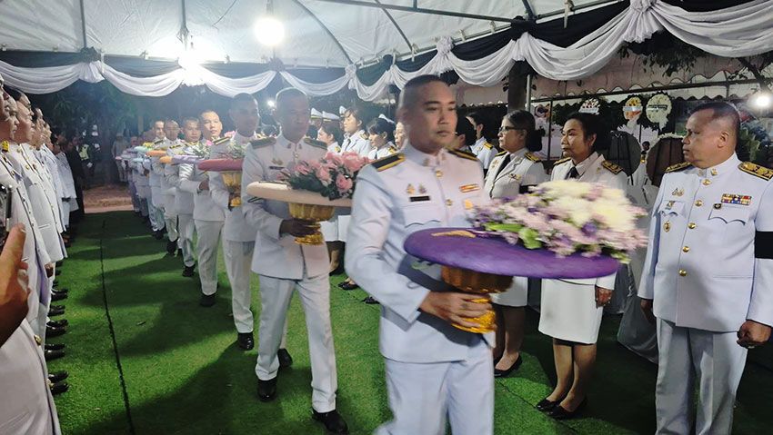 ในการนี้ ผู้ว่าราชการจังหวัดบุรีรัมย์ เชิญพวงมาลาพระราชทานของพระบาทสมเด็จพระเจ้าอยู่หัว และพวงมาลาพระราชทานของสมเด็จพระนางเจ้า ฯ พระบรมราชินี ไปวางที่หน้าหีบศพ พร้อมทั้งเชิญพวงมาลาพระราชทานและพวงมาลาประทาน ตามที่พระบรมวงศานุวงศ์ทรงพระกรุณาโปรดเกล้าโปรดกระหม่อมและโปรดประทาน วางที่หน้าหีบศพ