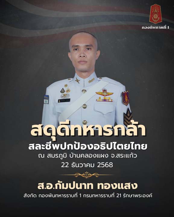 ล่าสุด กองทัพภาคที่ 1 ขอแสดงความเสียใจอย่างสุดซึ้งต่อครอบครัว “ส.อ.กัมปนาท ทองแสง” สังกัดกองพันทหารราบที่ 1 กรมทหารราบที่ 21 รักษาพระองค์ (ร.21รอ.) เสียชีวิตจากการปฏิบัติหน้าที่ปกป้องอธิปไตยของชาติ ในพื้นที่ชายแดนไทย-กัมพูชา บ้านคลองแผง อ.ตาพระยา จ.สระแก้ว เมื่อ 22 ธ.ค.68