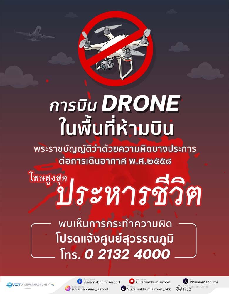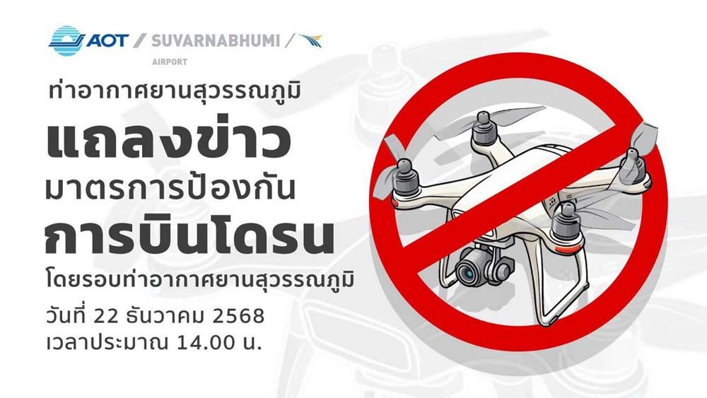 นาย กิตติพงศ์ กิตติขจร ผู้อำนวยการท่าอากาศยานสุวรรณภูมิ ออกมาแถลงข่าวบอกว่า จากกรณีช่วงค่ำคืนของวันที่ 20 ธันวาคม 68 ที่ผ่านมา มีชาวบ้านแจ้งเบาะแสพบโดรนบินรอบสนามบินสุวรรณภูมิ ทางสนามบินได้ดำเนินการประสานเจ้าหน้าที่ตำรวจ สภ.ท่าอากาศยานสุวรรณภูมิร่วมกับฝ่ายรักษาความปลอดภัยของท่าอากาศยานออกตรวจหาโดรนตามที่ชาวบ้านแจ้งเบาะแส ซึ่งในค่ำคืนดังกล่าวตนเองและผู้บัญชาการตำรวจภูธรภาค 1 ลงพื้นที่ตรวจหาด้วยตนเองเช่นกัน ซึ่งจากการตรวจสอบในค่ำคืนดังกล่าว พบว่ามีโดรนบินใกล้เคียงสนามบินจริงแต่เน้นย้ำว่ายังไม่มีการเข้ามาในพื้นที่ชั้นในของสนามบินแต่อย่างใด หลังจากมีการตรวจพบโดรนบินนอกรั้วของสนามบิน จึงมีการเข้าแผนเผชิญเหตุทันที ซึ่งมีการประสานการปฏิบัติฝ่ายความมั่นคงทุกส่วนที่เกี่ยวข้อง โดยเฉพาะกองทัพอากาศ ได้นำเครื่องมือในการตรวจจับและป้องกันโดรนที่จะเข้ามาในพื้นที่สนามบิน เข้ามาติดตั้งทันทีภายในค่ำคืนดังกล่าว เพื่อไม่ให้ลุกล้ำเข้ามาในเขตของสนามบิน โดยประสานร่วมกับศูนย์บังคับการบินหรือวิทยุการบินเพื่อให้เกิดความปลอดภัยของเครื่องบินในการขึ้นลงที่สนามบิน หลังจากนั้นในค่ำคืนที่สองยังปรากฏพบโดรนบ้างปะปลายตามข่าว ซึ่งจากการพิสูจน์ทราบพบว่ามีจำนวนน้อยกว่าในค่ำคืนวันแรก ขณะนี้ท่าอากาศยานสุวรรณภูมิ มีหน่วยงานความมั่น3 หน่วยงานหลักในการเข้ามาบูรณาการกำลังในการเฝ้าระวัง คือ กองทัพบก กองทัพอากาศ และสำนักงานตำรวจแห่งชาติ ที่จะคอยมอนิเตอร์และเฝ้าระวังโดรนที่จะเข้าในพื้นที่ จึงขอให้ความมั่นใจแก่ประชาชนหรือนักท่องเที่ยวที่จะมาใช้บริการท่าอากาศยานสุวรรณภูมิ นั้น มีความปลอดภัยสูงสุดแน่นอนทั้งนี้จึงอยากฝากเตือนสำหรับใครก็ตามที่คิดจะฝ่าฝืนบินโดรนในพื้นที่สนามบินสุวรรณภูมิหรือท่าอากาศยานทุกแห่ง นั้น จะมีโทษสูงสุดคือจำคุกตลอดชีวิตหรือประหารชีวิต จึงขอให้คิดและตะหนักไว้ให้ดีถึงโทษสูงสุด เนื่องจากพื้นที่สนามบินเป็นพื้นที่ความปลอดภัยและความมั่นคงสูงสุด