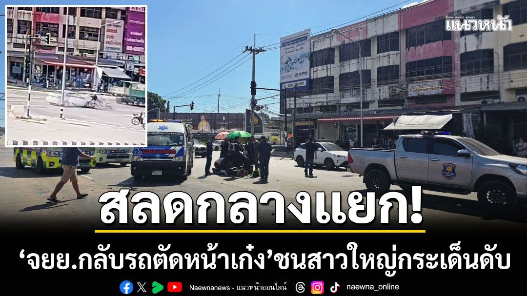สลดกลางแยก! ‘จยย.กลับรถตัดหน้าเก๋ง’ พุ่งชนเต็มแรง-ร่างหญิงวัย 63 กระเด็นดับ