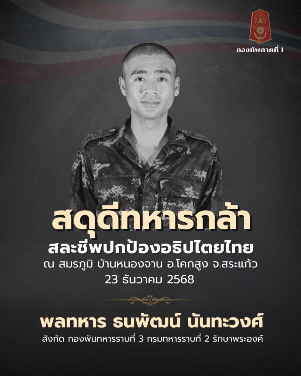 กองทัพภาคที่ 1 ขอแสดงความเสียใจอย่างสุดซึ้งต่อครอบครัว “พลทหาร ธนพัฒน์ นันทะวงศ์” สังกัด กองพันทหารราบที่ 3 กรมทหารราบที่ 2 รักษาพระองค์ เสียชีวิตจากการปฏิบัติหน้าที่ปกป้องอธิปไตยของชาติ ในพื้นที่ชายแดนไทย-กัมพูชา บ้านหนองจาน อ.โคกสูง จ.สระแก้ว เมื่อ 23 ธ.ค.68 เมื่อเวลา 15.30 น. ด้วยระเบิด ค.