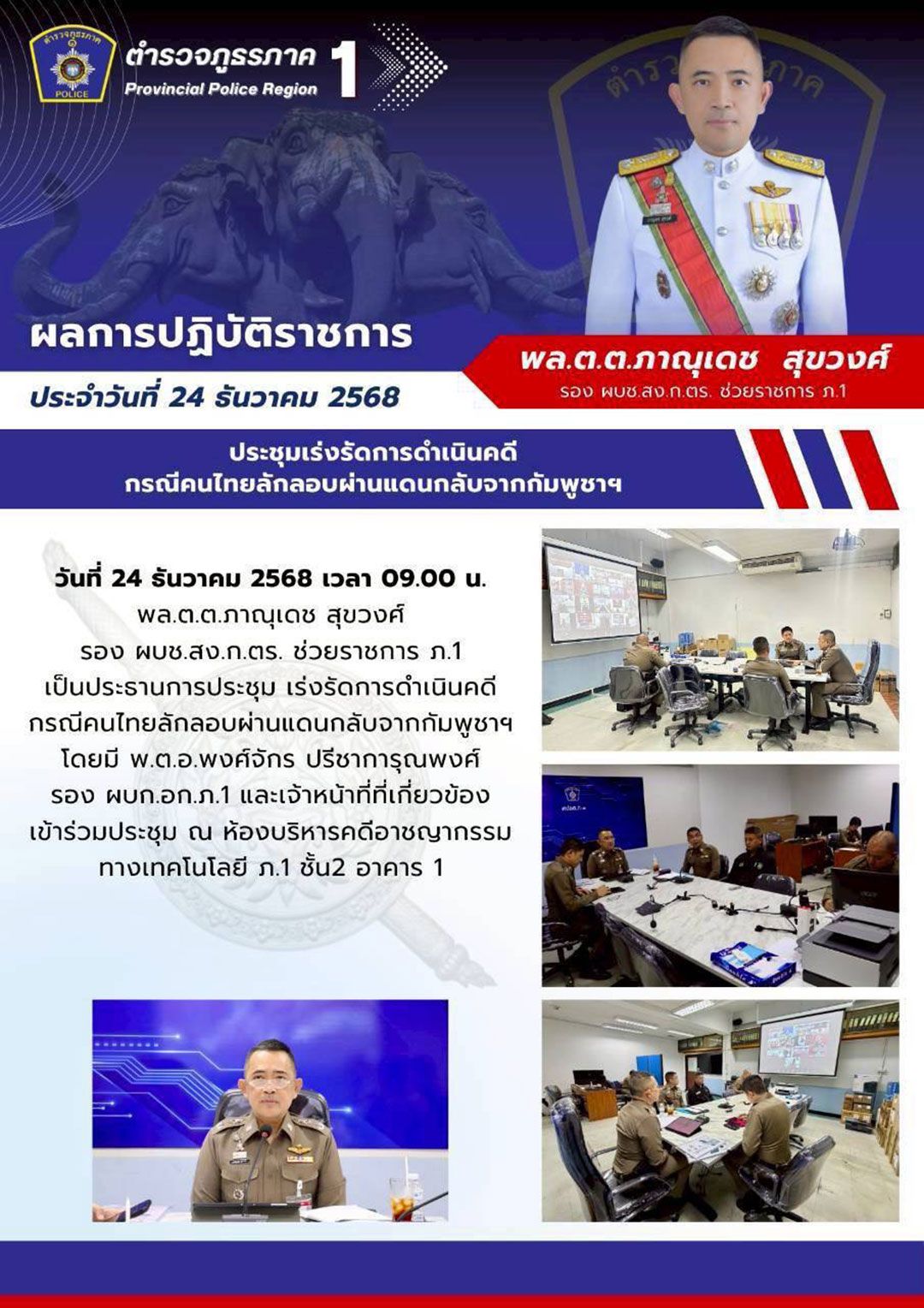 เมื่อวันที่ 24 ธันวาคม 2568 พล.ต.ต.ภาณุเดช สุขวงศ์ รอง ผบช.สง.ก.ตร. ช่วยราชการ ภ.1 เป็นประธานการประชุมเร่งรัดการดำเนินคดี กรณีคนไทยลักลอบผ่านแดนกลับจากกัมพูชา โดยมี พ.ต.อ.พงศ์จักร ปรีชาการุณพงศ์ รอง ผบก.อก.ภ.1 และเจ้าหน้าที่ที่เกี่ยวข้อง เข้าร่วมประชุม ณ ห้องบริหารคดีอาชญากรรม ทางเทคโนโลยี ภ.1 ชั้น2 อาคาร 1