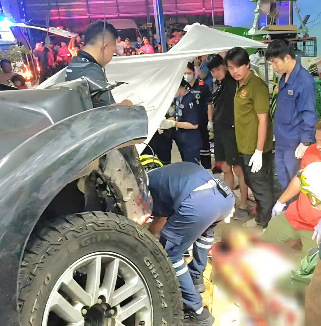 ในที่เกิดเหตุ พบรถยนต์กระบะแคป ติดคอกหลังสีดำ ทะเบียนกรุงเทพมหานคร พุ่งเข้าไปในร้านขายของชำจนพังเสียหาย 1 คูหา ตรวจสอบใต้ท้องรถพบร่างชาย 1 รายติดอยู่ เจ้าหน้าที่กู้ภัยต้องใช้เครื่องมือตัดถ่างนำร่างออกมาทำ CPR อย่างเร่งด่วนแต่ไม่สามารถยื้อชีวิตไว้ได้เนื่องจากถูกชนอย่างแรง นอกจากนี้ยังมีผู้บาดเจ็บอีก 4 ราย ถูกนำส่งโรงพยาบาลไปก่อนหน้า ในที่เกิดเหตุยังพบรถยนต์กระบะสีบรอนซ์ทองถูกเฉี่ยวชนท้าย และรถจักรยานยนต์เสียหายรวม 5 คัน