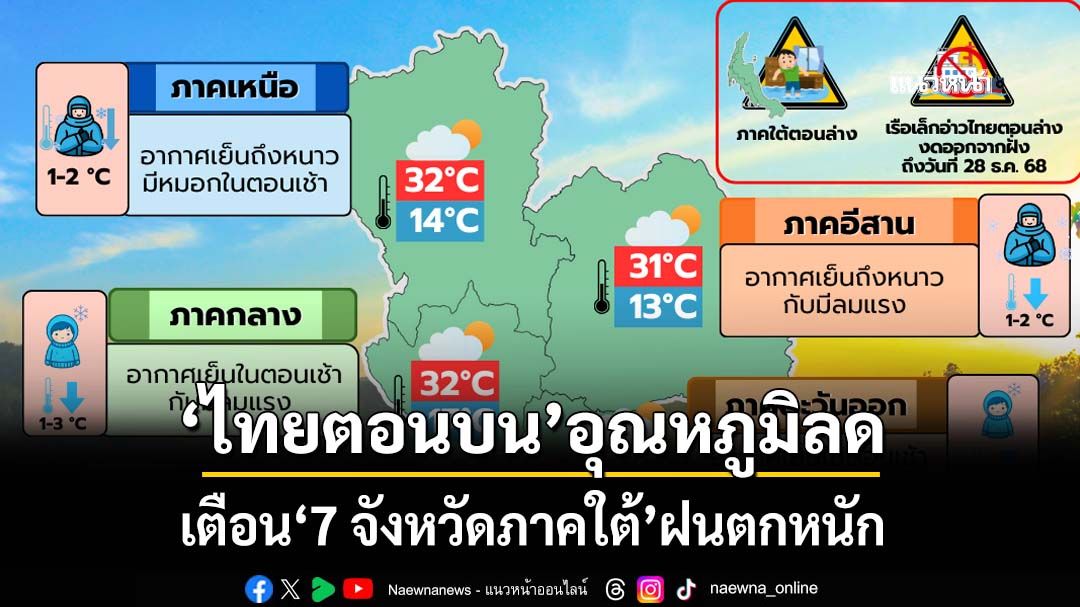 เช็คอากาศวันนี้! ‘ไทยตอนบน’อุณหภูมิลด เตือน‘7 จังหวัดภาคใต้’ฝนตกหนัก
