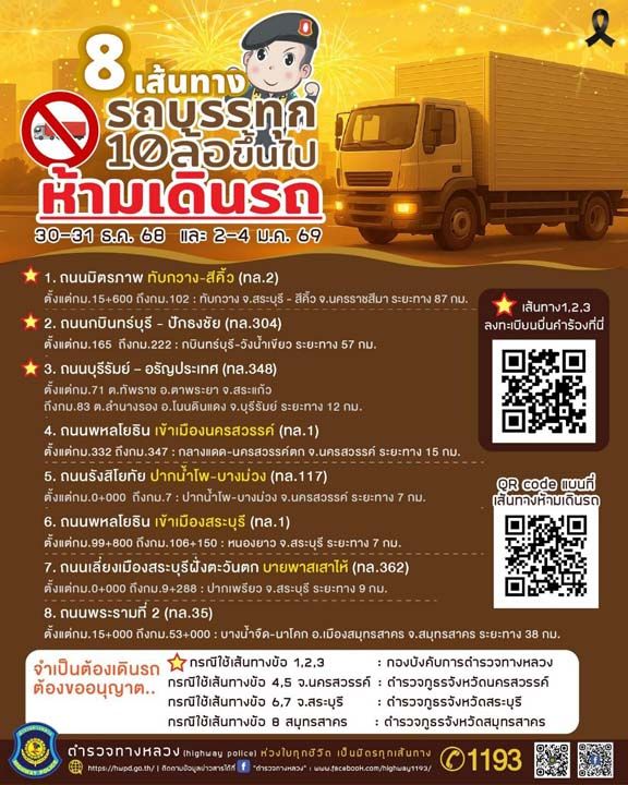 ทั้งนี้ เพื่อเพิ่มความปลอดภัยและลดปัญหาการจราจร พล.ต.อ.สำราญ ระบุว่า ได้มีมาตรการจำกัดการใช้เส้นทางของรถบรรทุกตั้งแต่ 10 ล้อขึ้นไป บนถนนสายหลักในบางช่วงเวลาตามที่กฎหมายกำหนด เว้นแต่รถที่มีความจำเป็น พร้อมขอความร่วมมือประชาชนใช้รถใช้ถนนด้วยความมีน้ำใจ เคารพกฎจราจร และร่วมกันดูแลความปลอดภัย เพื่อให้เทศกาลปีใหม่ 2569 เป็นช่วงเวลาแห่งความสุขและการเดินทางกลับบ้านอย่างปลอดภัยของทุกครอบครัว