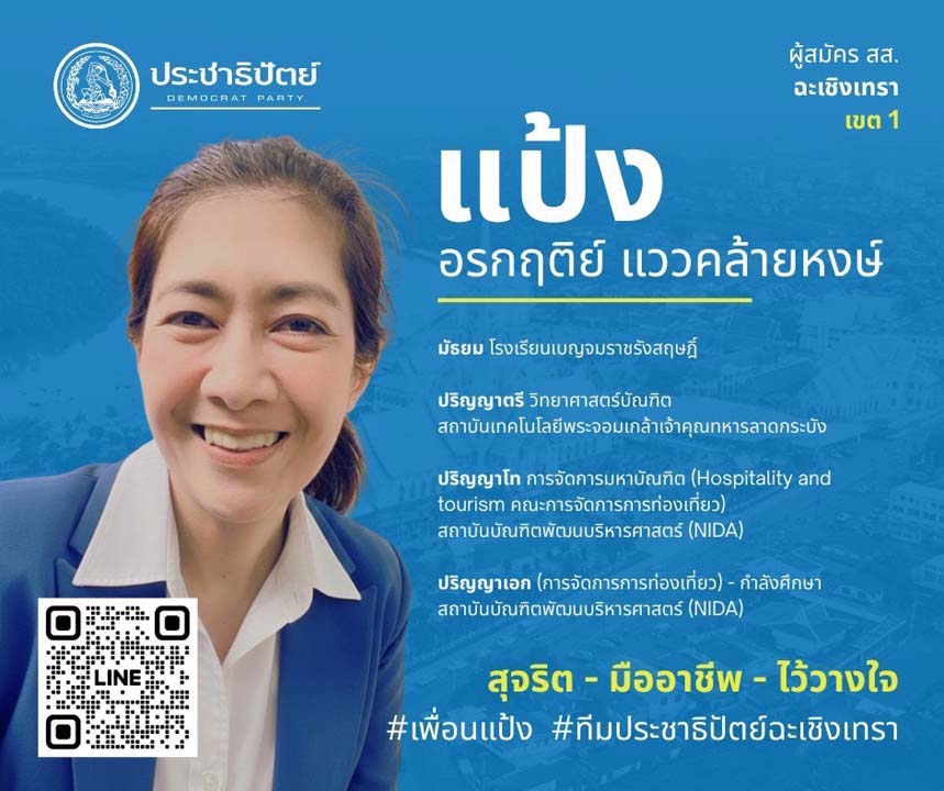 ‘ประชาธิปัตย์’ส่ง‘แป้ง อรกฤติย์’ชิง สส. เขต 1 สู้บ้านใหญ่‘ฉะเชิงเทรา’ ชูนโยบายดัน EEC Plus เปลี่ยน‘แปดริ้ว’จากเมืองผ่าน เป็นเมืองเศรษฐกิจ