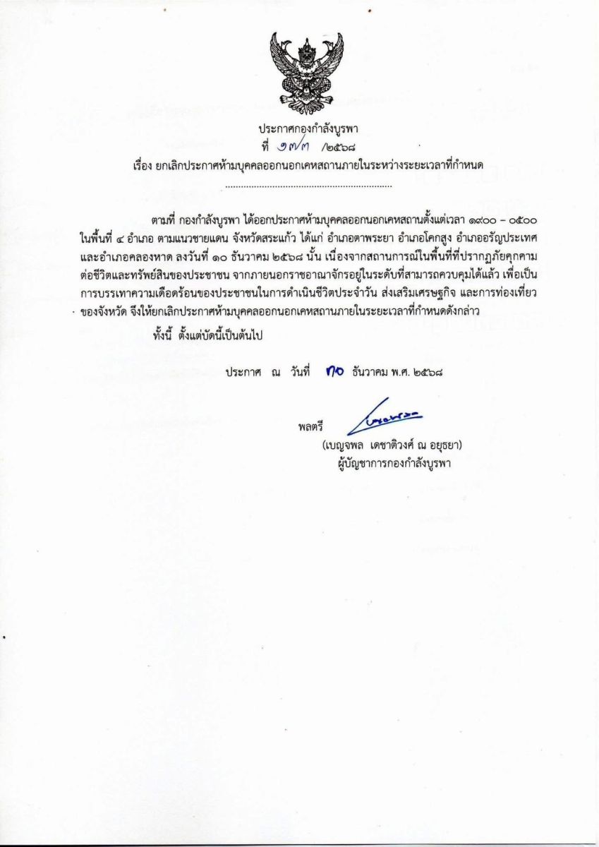 30 ธ.ค.68 กองกำลังบูรพา กองทัพภาคที่ 1 ยกเลิกประกาศห้ามบุคคลออกนอกเคหสถานภายในระหว่างระยะเวลาที่กำหนด ตามที่ กองกำลังบูรพา ได้ออกประกาศห้ามบุคคลออกนอกเคหสถานตั้งแต่เวลา 19.00 น. - 05.00 น. ในพื้นที่อำเภอ ตามแนวชายแดน จังหวัดสระแก้ว ได้แก่ อำเภอตาพระยา อำเภอโคกสูง อำเภออรัญประเทศ และอำเภอคลองหาด ลงวันที่ 10 ธันวาคม 2568 นั้น
