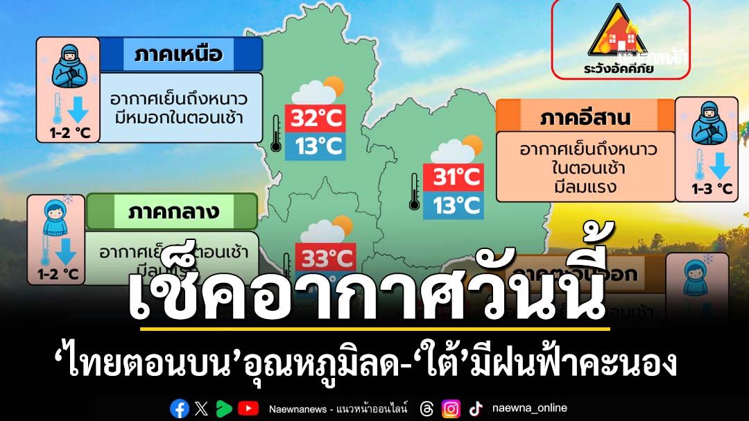 เช็คอากาศวันนี้! ‘ภาคใต้’มีฝนฟ้าคะนองบางแห่ง ‘ไทยตอนบน’อุณหภูมิลด 1-3 องศาฯ