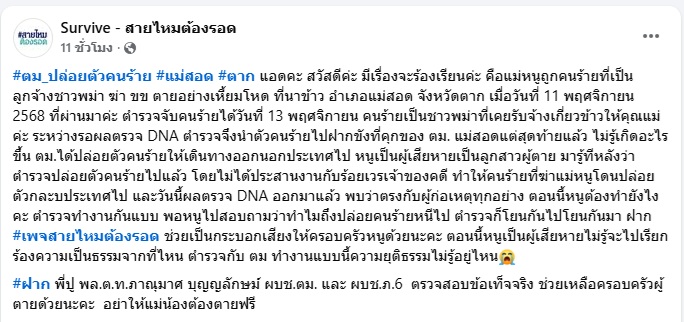 หญิงสาวรายนี้ ระบุว่า “สวัสดีค่ะ มีเรื่องจะร้องเรียนค่ะ คือแม่หนูถูกคนร้ายที่เป็นลูกจ้างชาวพม่า ฆ่า ขข ตายอย่างเหี้ยมโหด ที่นาข้าว อำเภอแม่สอด จังหวัดตาก เมื่อวันที่ 11 พฤศจิกายน 2568 ตำรวจจับคนร้ายได้วันที่ 13 พฤศจิกายน คนร้ายเป็นชาวพม่าที่เคยรับจ้างเกี่ยวข้าวให้คุณแม่ค่ะ ระหว่างรอผลตรวจ DNA ตำรวจจึงนำตัวคนร้ายไปฝากขังที่คุกของ ตม. แม่สอด”