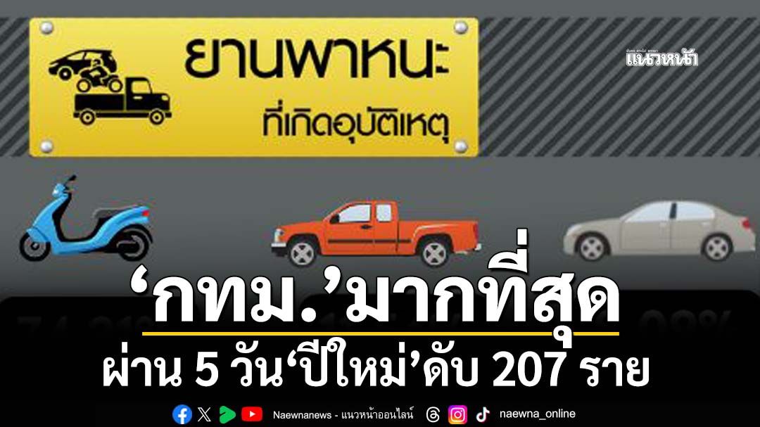 ผ่าน 5 วันปีใหม่ ดับสังเวยบนท้องถนน 207 ราย เกิดอุบัติเหตุ 1,185 ครั้ง บาดเจ็บเพียบ 1,141 คน ‘กทม.-ภูเก็ต’ยังสูญเสียสะสมมากที่สุด ขณะที่ 9 จังหวัดตายเป็นศูนย์ ‘ศปถ.’กำชับเข้มรับประชาชนเดินทางกลับ ตั้งจุดตรวจ-จุดบริการประชาชน เน้นคุม‘ขับเร็ว-ง่วง’ อำนวยความสะดวกในการเดินทาง ย้ำ‘รถโดยสารสาธารณะ’ต้องตรวจเช็คคนขับ-สภาพรถ จัดเตรียมให้เพียงพอ เตือนขับขี่ด้วยความระมัดระวัง