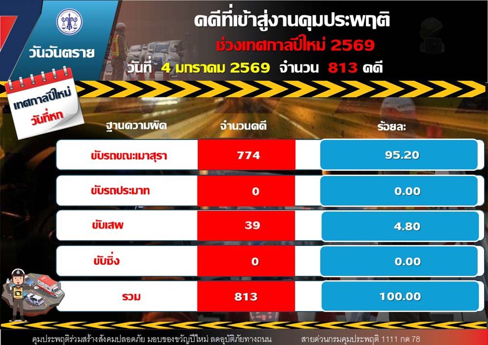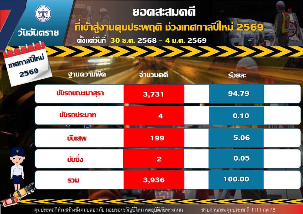 ขณะที่ยอดคดีสะสมตลอด 6 วัน (30 ธันวาคม 2568 – 4 มกราคม 2569) รวมทั้งสิ้น 3,936 คดี แบ่งเป็น