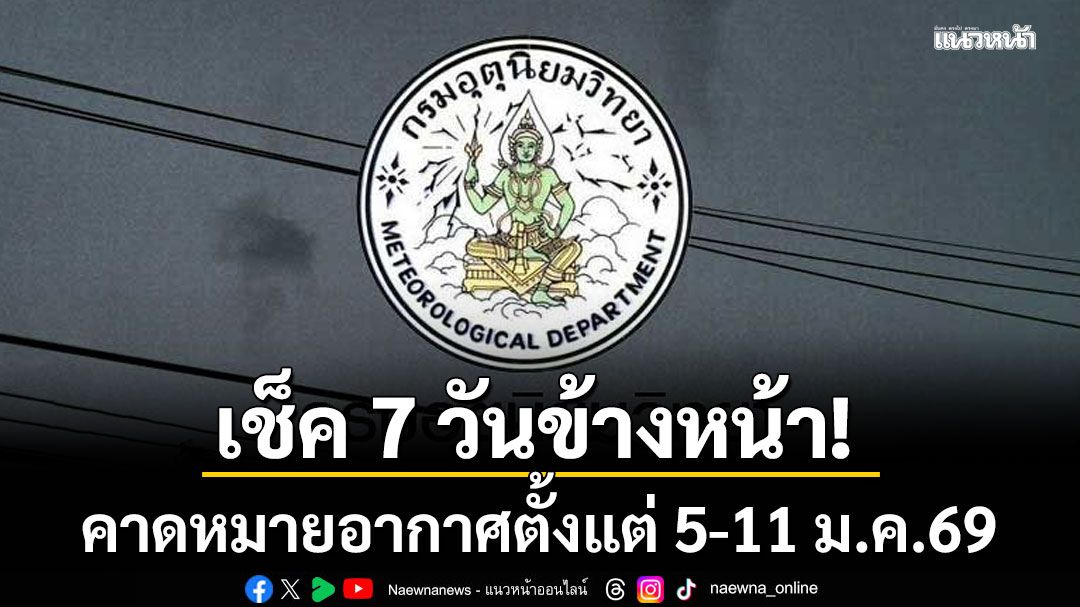 เมื่อเวลา 12.00 น.วันที่ 5 มกราคม 2569 กรมอุตุนิยมวิทยา คาดหมายอากาศทั่วไป พยากรณ์อากาศ 7 วันข้างหน้า ระหว่างวันที่ 5 -11 มกราคม 2569 ดังนี้