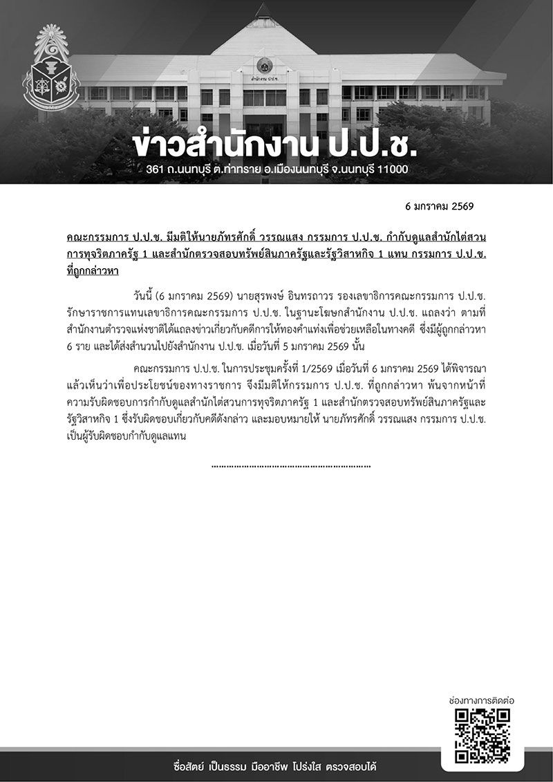 คณะกรรมการ ป.ป.ช. ในการประชุมครั้งที่ 1/2569 เมื่อวันที่ 6 มกราคม 2569 ได้พิจารณาแล้วเห็นว่าเพื่อประโยชน์ของทางราชการ จึงมีมติให้กรรมการ ป.ป.ช. ที่ถูกกล่าวหา พ้นจากหน้าที่ ความรับผิดชอบการกำกับดูแลสำนักไต่สวนการทุจริตภาครัฐ 1 และสำนักตรวจสอบทรัพย์สินภาครัฐและรัฐวิสาหกิจ 1 ซึ่งรับผิดชอบเกี่ยวกับคดีดังกล่าว และมอบหมายให้ นายภัทรศักดิ์ วรรณแสง กรรมการ ป.ป.ช. เป็นผู้รับผิดชอบกำกับดูแลแทน