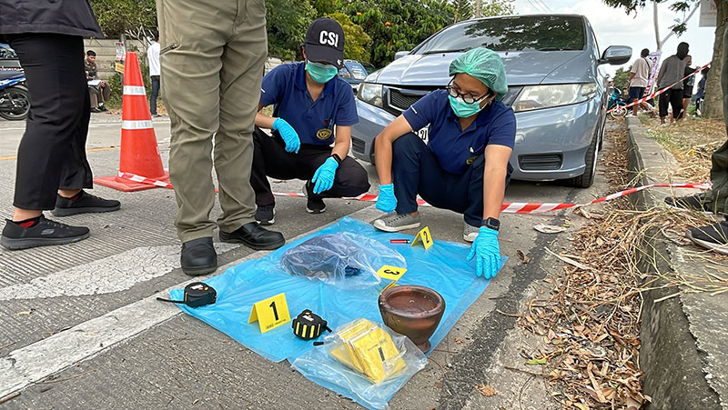 ที่เกิดเหตุพบรถเก๋ง ฮอนด้า ซิตี้ สีเทา ทะเบียนกทม. จอดอยู่ประตูถูกปิดล็อก ภายในรถฝั่งคนนั่งคู่คนขับพบศพ น.ส.ลักษมี อายุ 36 ปี อยู่บ้านเลขชาวพื้นที่ ต.ปลายบาง อ.บางกรวย จ.นนทบุรี สภาพศพนอนหงายเบาะนั่งปรับเอนไปด้านหลัง สวมกางเกงยีนส์ขาสั้น สวมเสื้อลาย นิ้วมือทั้งสองข้างเกร็ง ตรวจสอบตามร่างกายไม่พบบาดแผลหรือร่องรอยการถูกทำร้าย ข้างลำตัวพบโทรศัพท์มือถือตกอยู่ที่เบาะ ส่วนที่พื้นข้างคนขับพบครกหิน 1 อัน ภายในมีถ่านมอดไหม้เหลือแต่ขี้เถ้า และถุงถ่านจำนวน 1 ถุง
