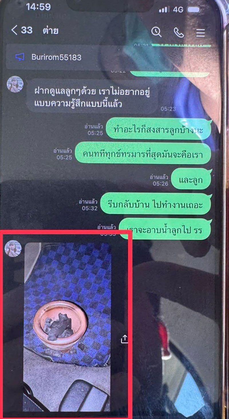 ตนส่งข้อความทิ้งให้ภรรยาไว้ตั้งแต่เมื่อคืนช่วงเวลาประมาณ 4-5 ทุ่ม ว่าไปนอนที่ไหน ด้วยความที่เป็นผัวเมียกัน แล้วตอนตี 5 เขาก็ส่งรูปมาว่าเขานอนอยู่ริมถนน แล้วพิมพ์ข้อความมาตัดพ้อ และฝากดูลูกด้วย เขาไม่อยากอยู่แล้ว ซึ่งตนก็ไม่เข้าใจว่ามันจะหนักหนาอะไรขนาดนั้น ที่ผ่านมาตนประคองชีวิตคู่กับเขามาตลอด และไม่มีการทะเลาะกันสุดท้ายตนก็ต้องช่วยเหลือเขาตลอด ทิ้งเขาไม่ได้เพราะมีลูกด้วยกัน 2 คน คิดว่าเขามีปัญหาเรื่องพนันออนไลน์ ที่ผ่านมาก็เตือนเขาตลอด