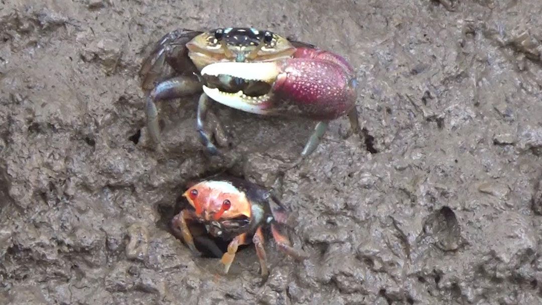 โดยการนั่งนิ่ง ๆ เป็นเวลาประมาณ 1-2 นาที ฝูงปูก้ามดาบก็จะค่อย ๆ ออกจากรูเพื่อขี้นมากินเศษซากพืช ซากสัตว์ขนาดเล็ก ที่ลอยมาติดอยู่บนผิวดิน พบเห็นได้ทั้งชนิดสีเดียวกันทั้งตัว และมี 2-3 สีในตัวเดียวกัน โดยปูก้ามดาบตัวผู้จะมีก้ามข้างหนึ่งใหญ่กว่าอีกข้างหนึ่งหรือมีก้ามที่ใหญ่กว่าลำตัว เพื่อเอาไว้ข่มศัตรู ใช้จับหรือคีบอาหาร และใช้เกี้ยวตัวเมีย ส่วนตัวเมียมีก้ามทั้งสองข้างเท่ากัน พบเห็นมากที่สุดคือ ปูก้ามดาบที่มีก้ามสีเหลือง ลำตัวสีฟ้าหรือสีขาว-ดำ โดยมีการเปลี่ยนสีไปช่วงอายุ ซึ่งตัวโตเต็มวัยจะมีสีที่เข้มขึ้น เพื่อไว้ดึงดูดเพศตรงข้าม