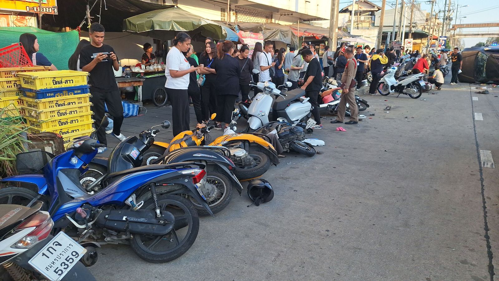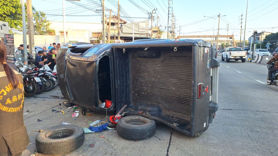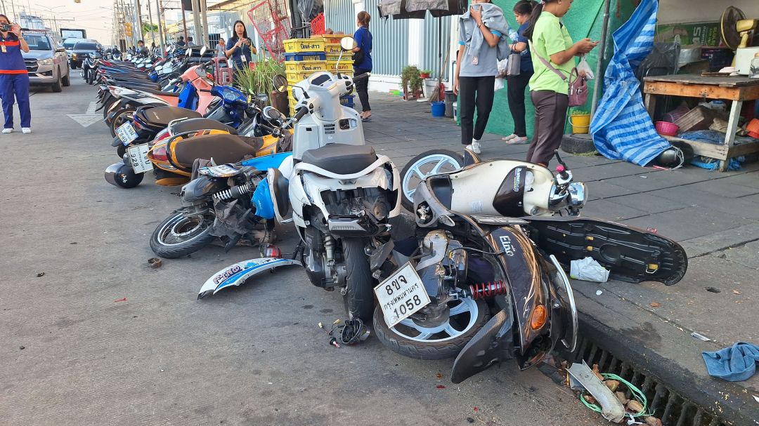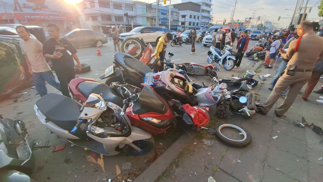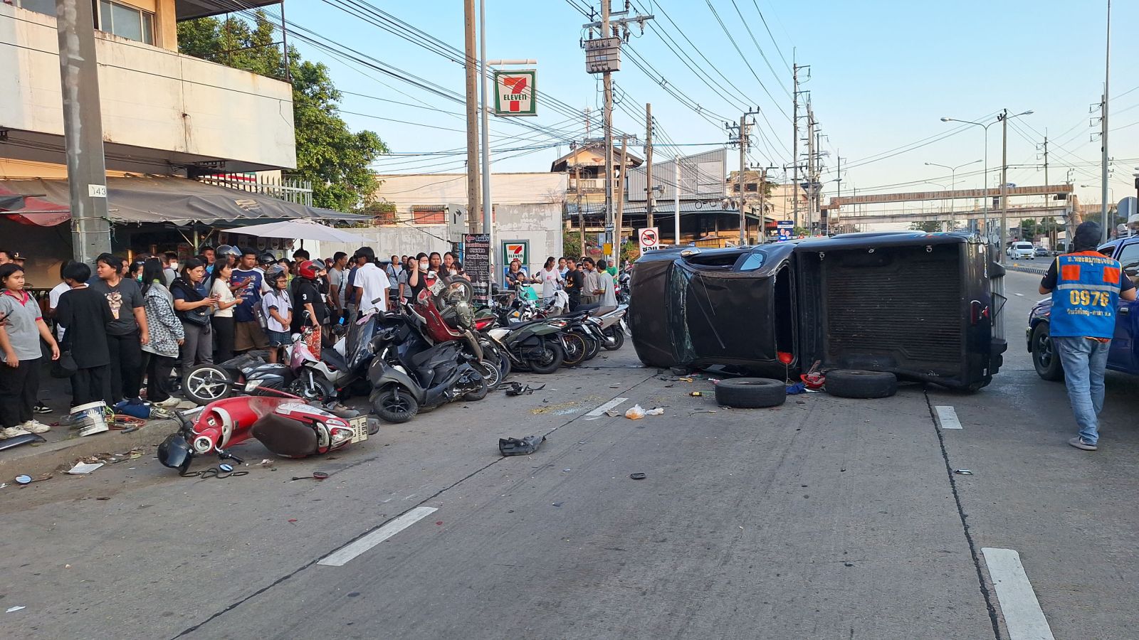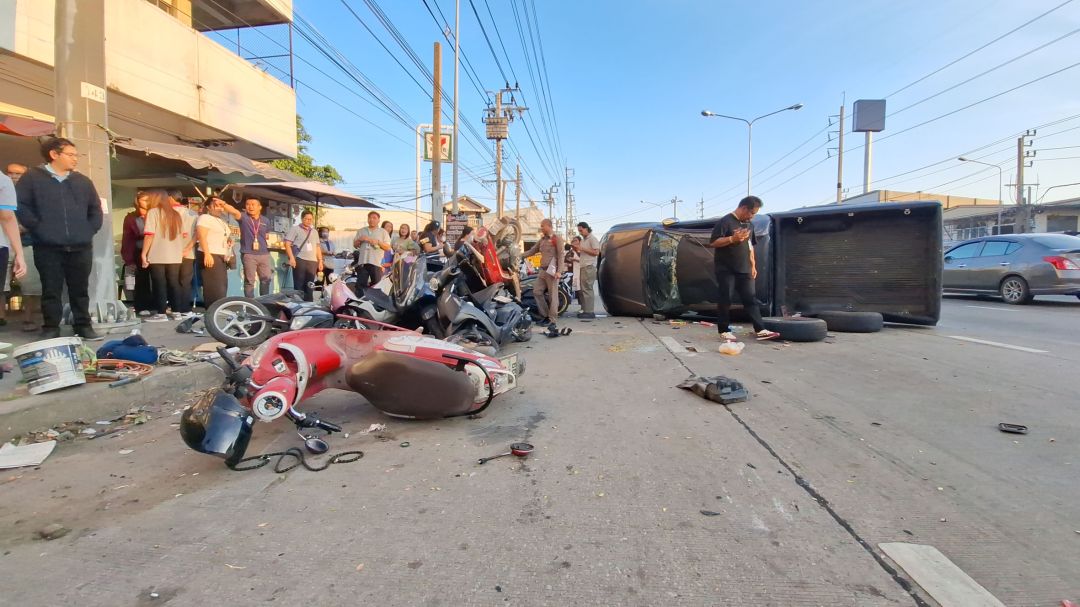 จ.สมุทรปราการ หนุ่มช่างรับเหมาควบกระบะกลับบ้าน ก้มหน้าจุดบุหรี่ รถเสียหลัก ชนรถจักรยานยนต์จอดข้างทางพังเสียหายยับ 30 คัน