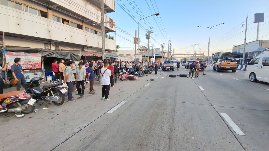 ที่เกิดเหตุ เป็นถนน 4 เลน บริเวณเลนซ้ายสุด ติดฟุตบาทพบรถจักรยานยนต์ล้มกลิ้งระเนระนาดพังยับนับรวมกันแล้ว 30 คัน บางคันขึ้นไปเกยกันจนกองเป็นภูเขาขนาดย่อม โดยมีพนักงานบริษัท เจ้าของรถและชาวบ้านต่างยืนมุ่งดูจนแน่ขนัดเต็มฟุตบาท ห่างกันเล็กน้อยพบรถคู่กรณีเป็นรถยนต์กระบะ ยี่ห้อ มิตซูบิชิ รุ่นไทรทัน สีน้ำตาล หมายเลขทะเบียน ผร 7409 ชลบุรี พลิกตะแคงไปด้านซ้ายในสภาพพังยับเยิน ในที่เกิดเหตุ คนขับได้รับบาดเจ็บเล็ก