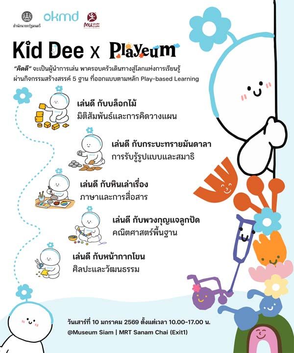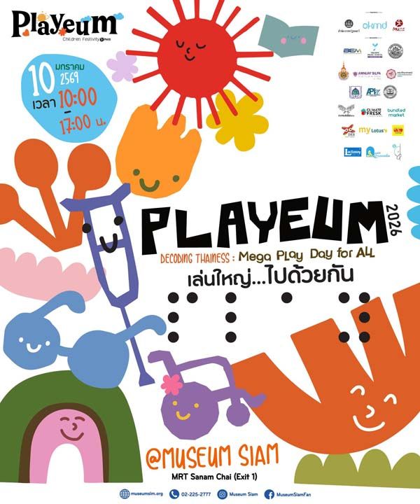 อีกหนึ่งพื้นที่สำคัญคือ Museum Siam สถานีรถไฟฟ้าใต้ดินสนามไชย ซึ่งร่วมกับ OKMD จัดกิจกรรม Kid Dee x Playeum : Think Good | Play Well | Grow Together ภายใต้แนวคิด PLAYEUM 2026: Decoding Thainess ระหว่างเวลา 10.00–17.00น. เปิดพื้นที่ประวัติศาสตร์ให้กลายเป็นสนามเล่นแห่งการเรียนรู้แบบ Inclusive Play เด็กๆ จะได้ร่วมกิจกรรมถอดรหัสความเป็นไทยผ่านฐานการเล่นทั้งด้านประสาทสัมผัส ศิลปะ วัฒนธรรม การเคลื่อนไหว และการสร้างสรรค์
