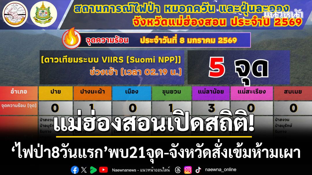 โดยข้อมูลสะสมตั้งแต่วันที่ 1 – 8 มกราคม 2569 พบจุดความร้อน (Hotspot) สะสมรวม 21 จุด โดยเกิดขึ้นในเขตป่าสงวนแห่งชาติมากที่สุด (16 จุด) โดยอำเภอที่พบสูงสุดคือ อ.แม่ลาน้อย (8 จุด) ขณะที่คุณภาพอากาศ (PM2.5) ทุกสถานีวัดอยู่ในระดับดีถึงดีมาก (ค่าเฉลี่ย 6.7 – 19.4 ไมโครกรัม/ลูกบาศก์เมตร) ซึ่งยังไม่เกินค่ามาตรฐาน 37.5 ไมโครกรัม/ลูกบาศก์เมตร